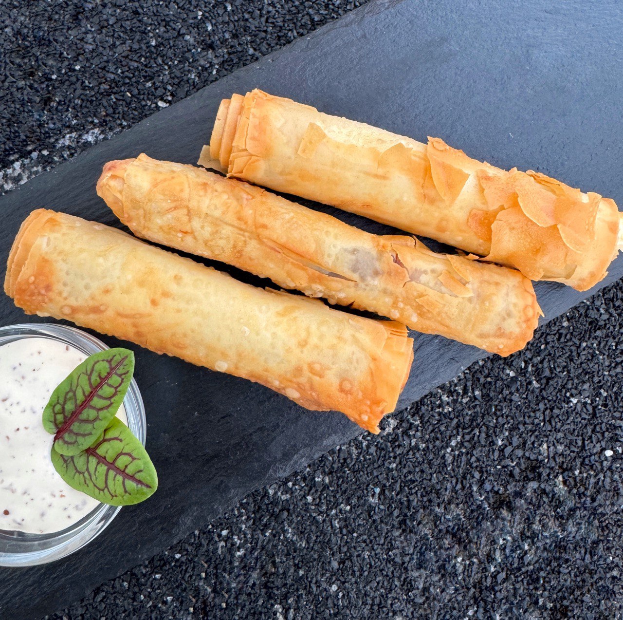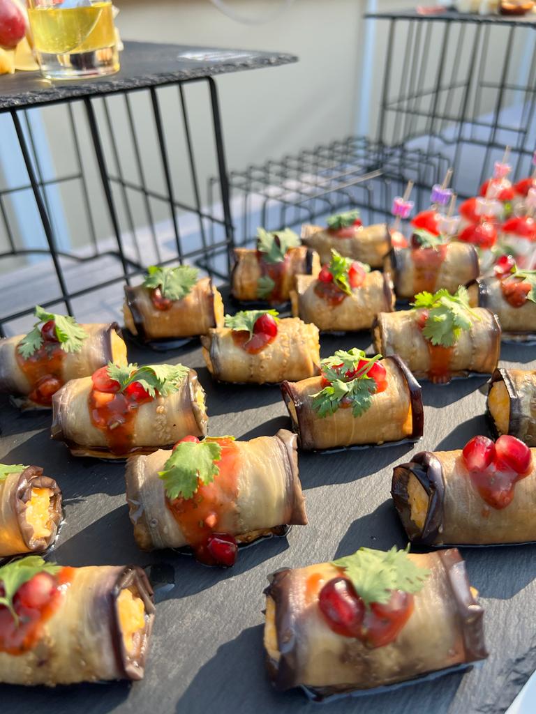 Рулетик из баклажана гриль, сливочного сыра с чесноком и гранатом