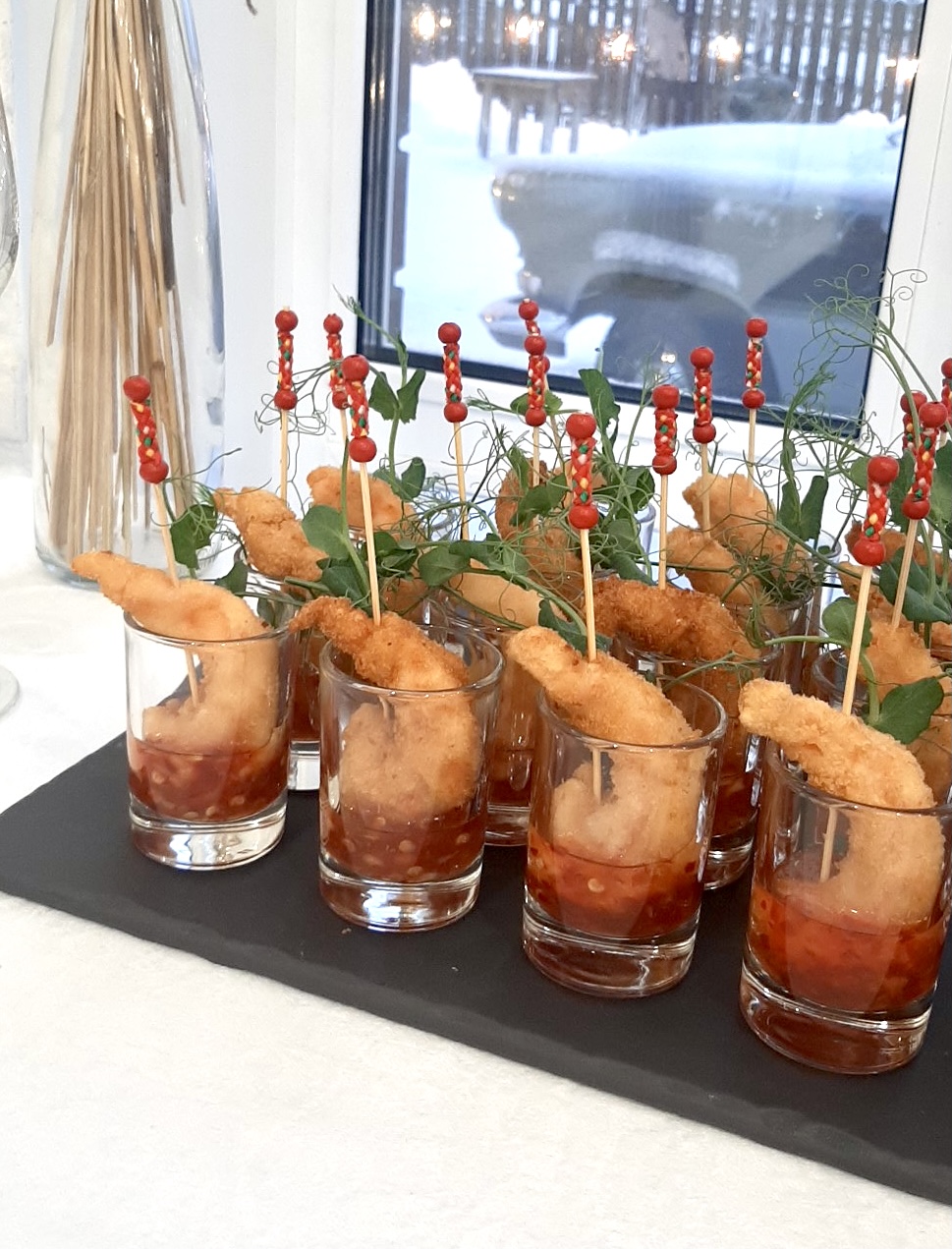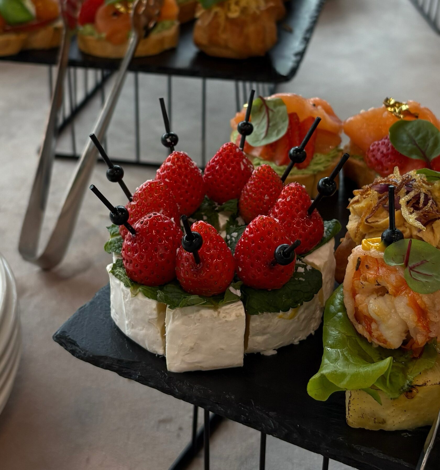 Канапе из креветки, жаренного сыра Камамбер, с томатами Черри