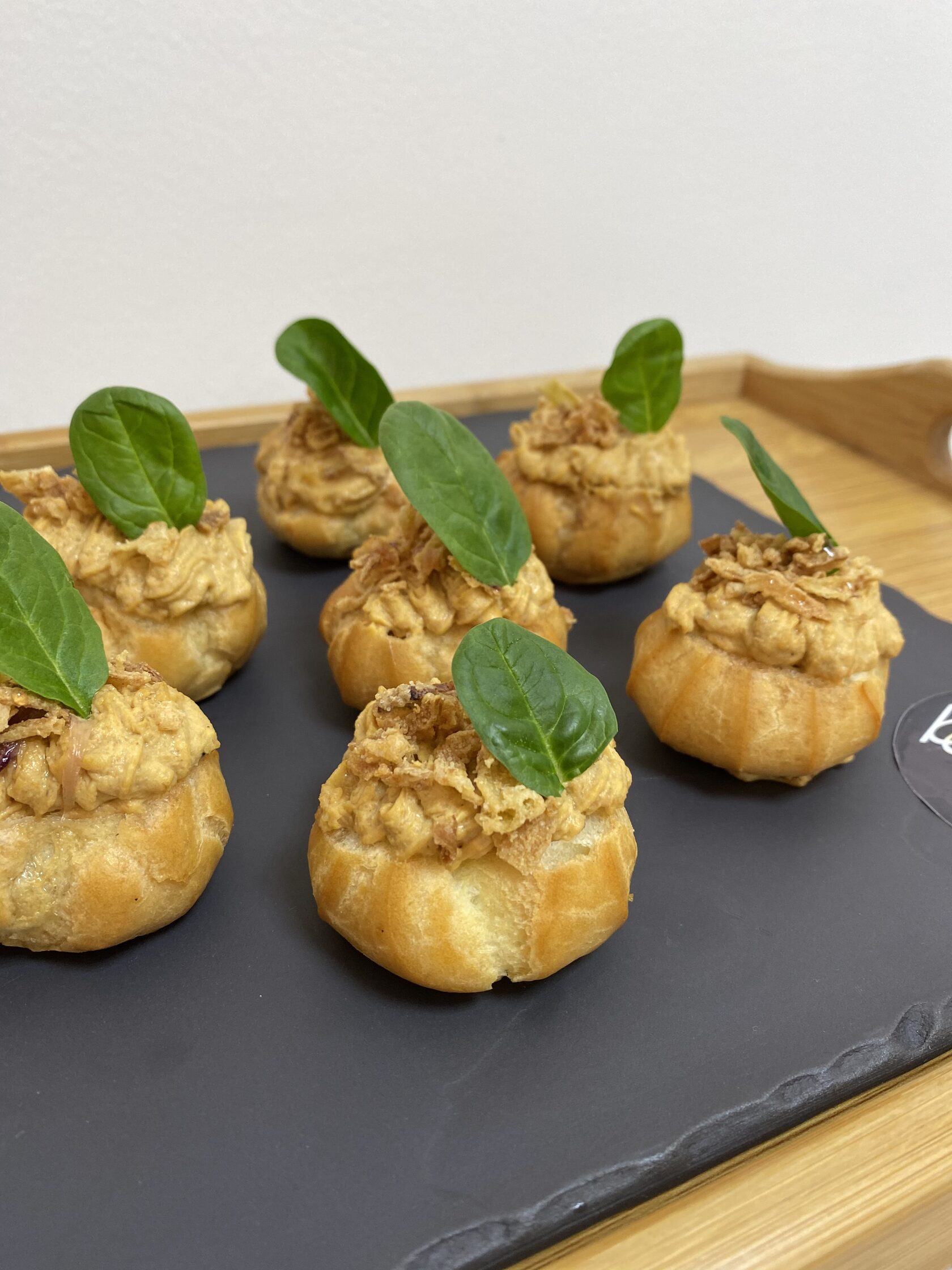Мини-эклер с прошутто, сыром и вялеными томатами